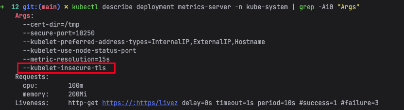 kubectl describe deployment metrics-server -n kube-system | grep -A10 "Args"