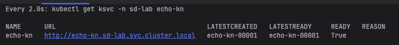 watch -n 2 kubectl get ksvc -n sd-lab echo-kn