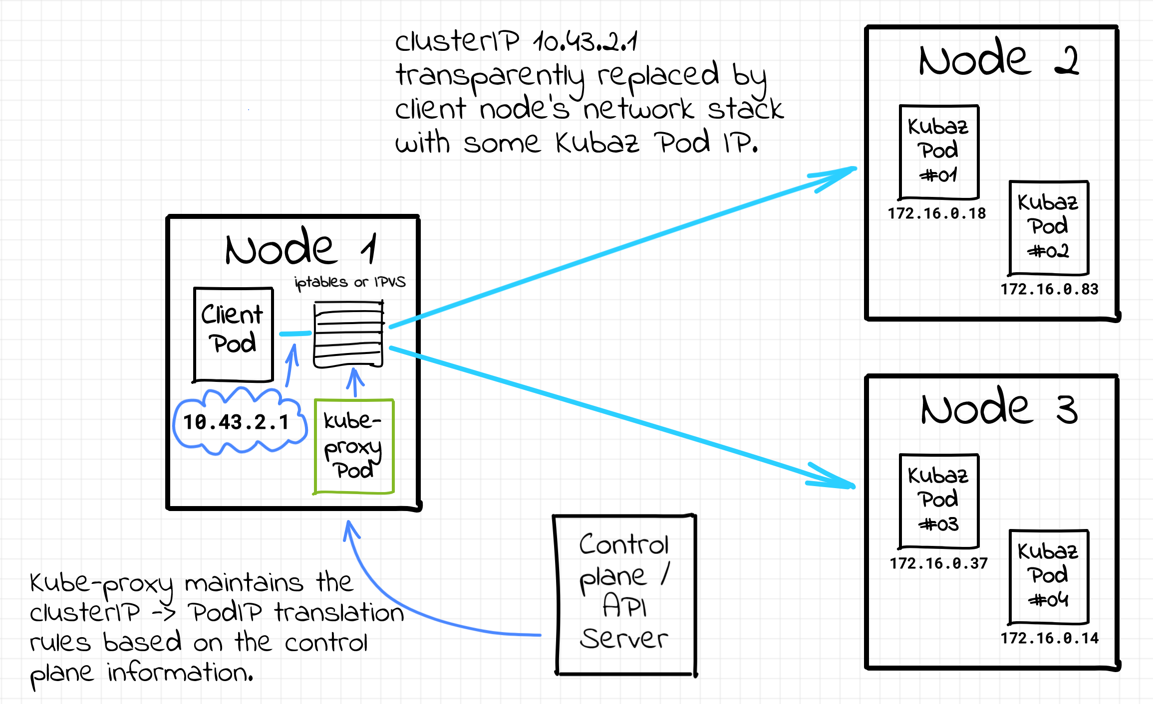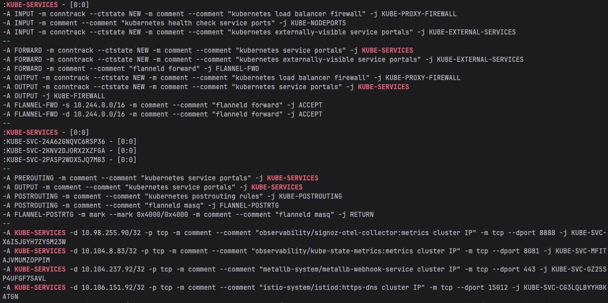kube-proxy가 iptables 또는 IPVS 규칙을 생성하여 커널 레벨에서 트래픽을 라우팅하는 구조입니다.