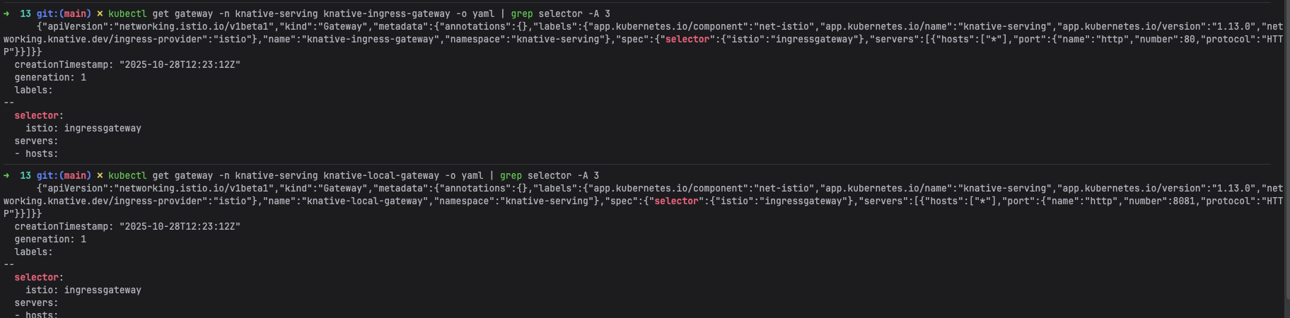 kubectl get gateway -n knative-serving knative-ingress-gateway -o yaml | grep selector -A 3