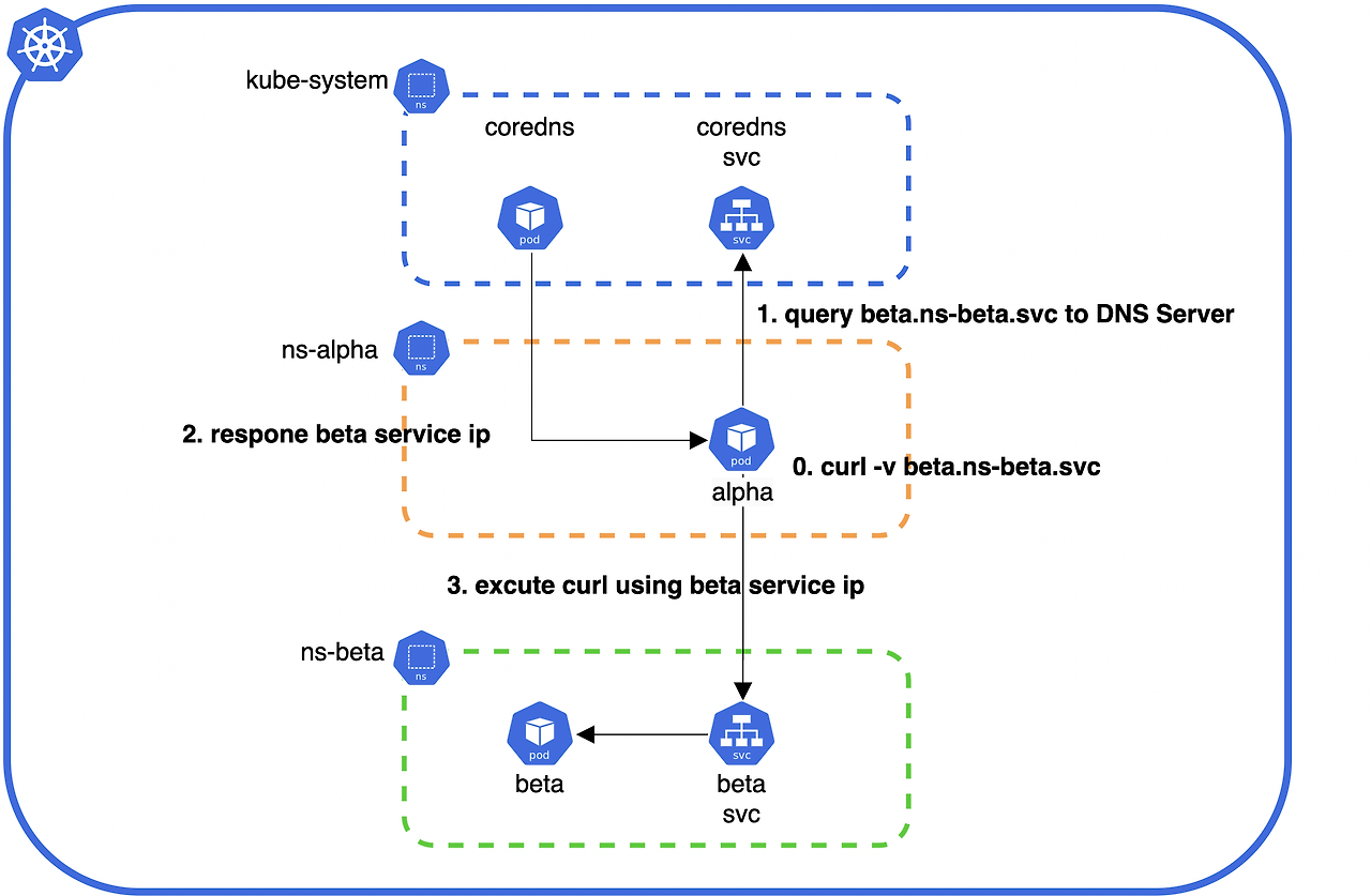 Kubernetes는 CoreDNS를 통해 각 Service 이름을 FQDN(Fully Qualified Domain Name) 형태로 등록합니다.