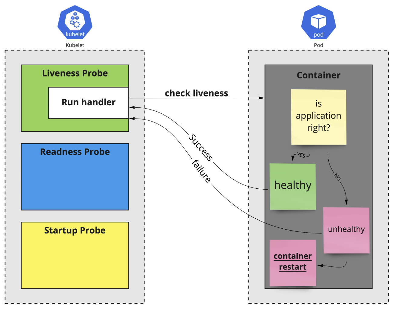 livenessProbe 구성을 기반으로, 주기(periodSeconds)마다 Run Handler를 실행합니다.httpGet, tcpSocket, exec 방식 중 하나로 상태를 점검합니다.healthy로 판단하고 그대로 유지합니다.unhealthy로 간주합니다.failureThreshold 횟수만큼 연속 실패하면 Kubelet이 컨테이너를 재시작합니다.