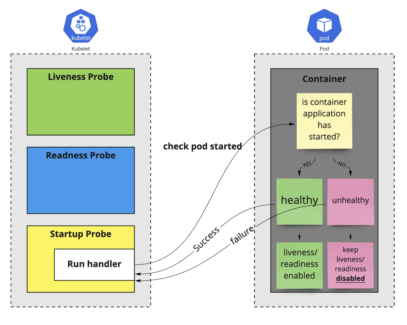 startupProbe 구성을 기반으로, 컨테이너 시작 시 Run Handler를 실행합니다.httpGet, tcpSocket, exec 방식 중 하나로 애플리케이션의 기동 여부를 점검합니다.healthy로 판단하고, Liveness/Readiness Probe를 활성화합니다.unhealthy로 간주하며, Liveness/Readiness Probe를 비활성 상태로 유지합니다.failureThreshold 횟수만큼 연속 실패하면 Kubelet이 컨테이너를 재시작합니다.startupProbe: