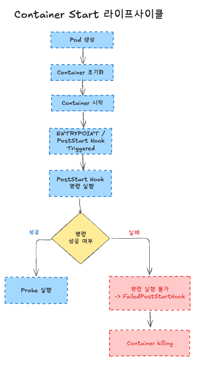 | 타이밍 보장 | postStart 명령어는 컨테이너의 ENTRYPOINT와 동시에 실행 | 애플리케이션 컨테이너가 시작되기 전에 모든 초기화 컨테이너는 성공적으로 종료가 완료되어야함 |