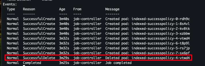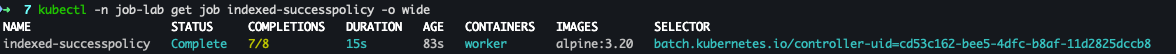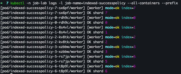 kubectl -n job-lab logs -l job-name=indexed-successpolicy --all-containers --prefix