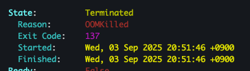 # OOMKilled(137) → 실패 카운트 증가(Count) 후 backoff 전략 적용