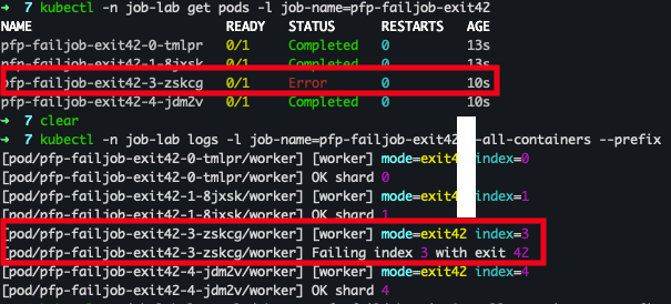kubectl -n job-lab logs -l job-name=pfp-failjob-exit42 --all-containers --prefix