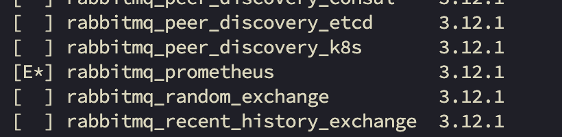 플러그인 설치가 되었다면 아래 명령어를 입력하였을때 ‘rabbitmq_prometheus’에 E* 라고 표시되면 설치가 완료된 것입니다.
