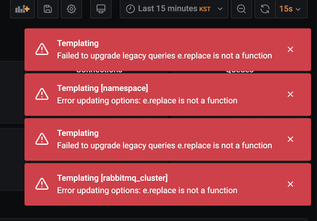 다만 Redis 대시보드 연결에서 발생했던 문제 처럼 Grafana, Prometheus 버전 이슈로 인하여 아래 화면 같이 에러가 발생하는 케이스가 있습니다.