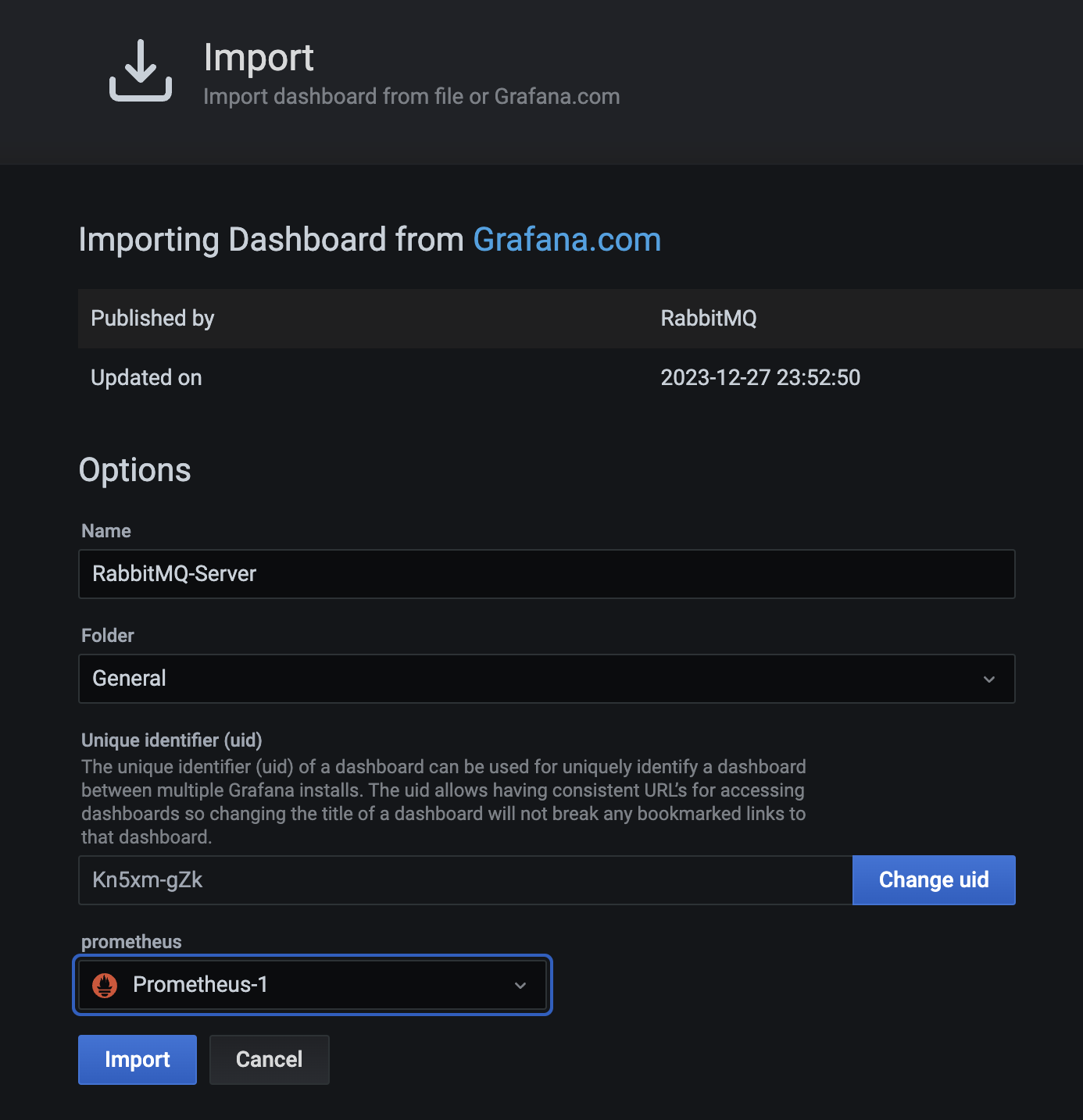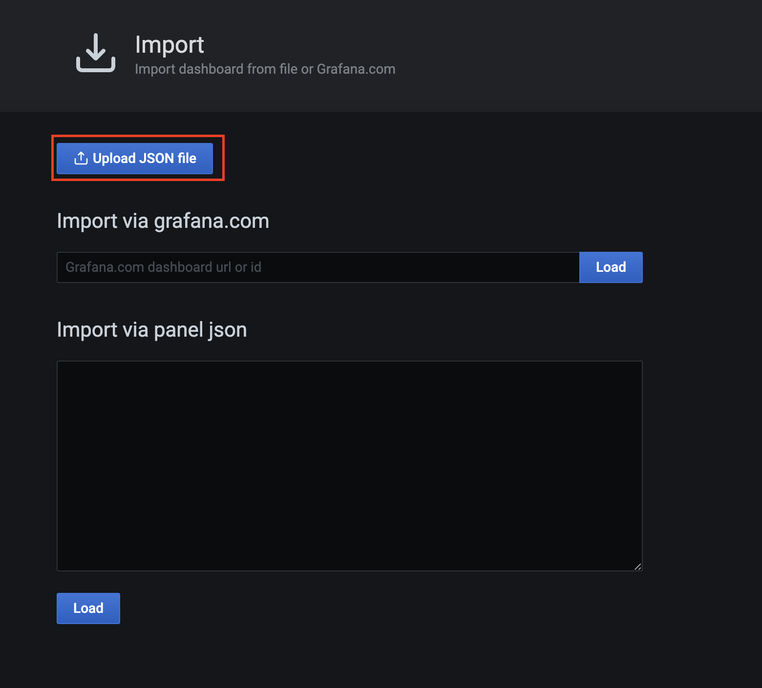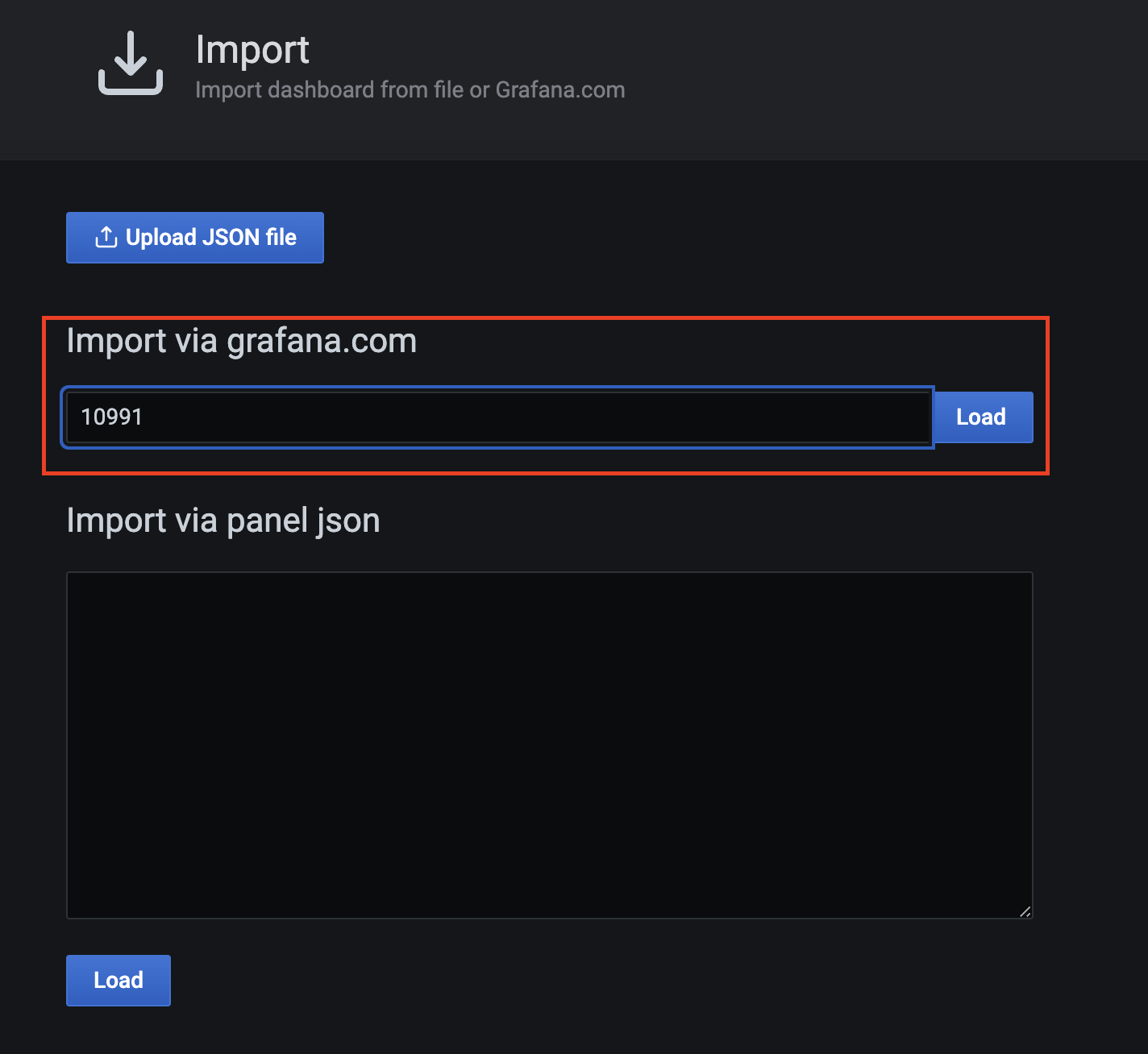 Import via에 복사한 dashboard ID 붙여놓고 Load 버튼을 클릭