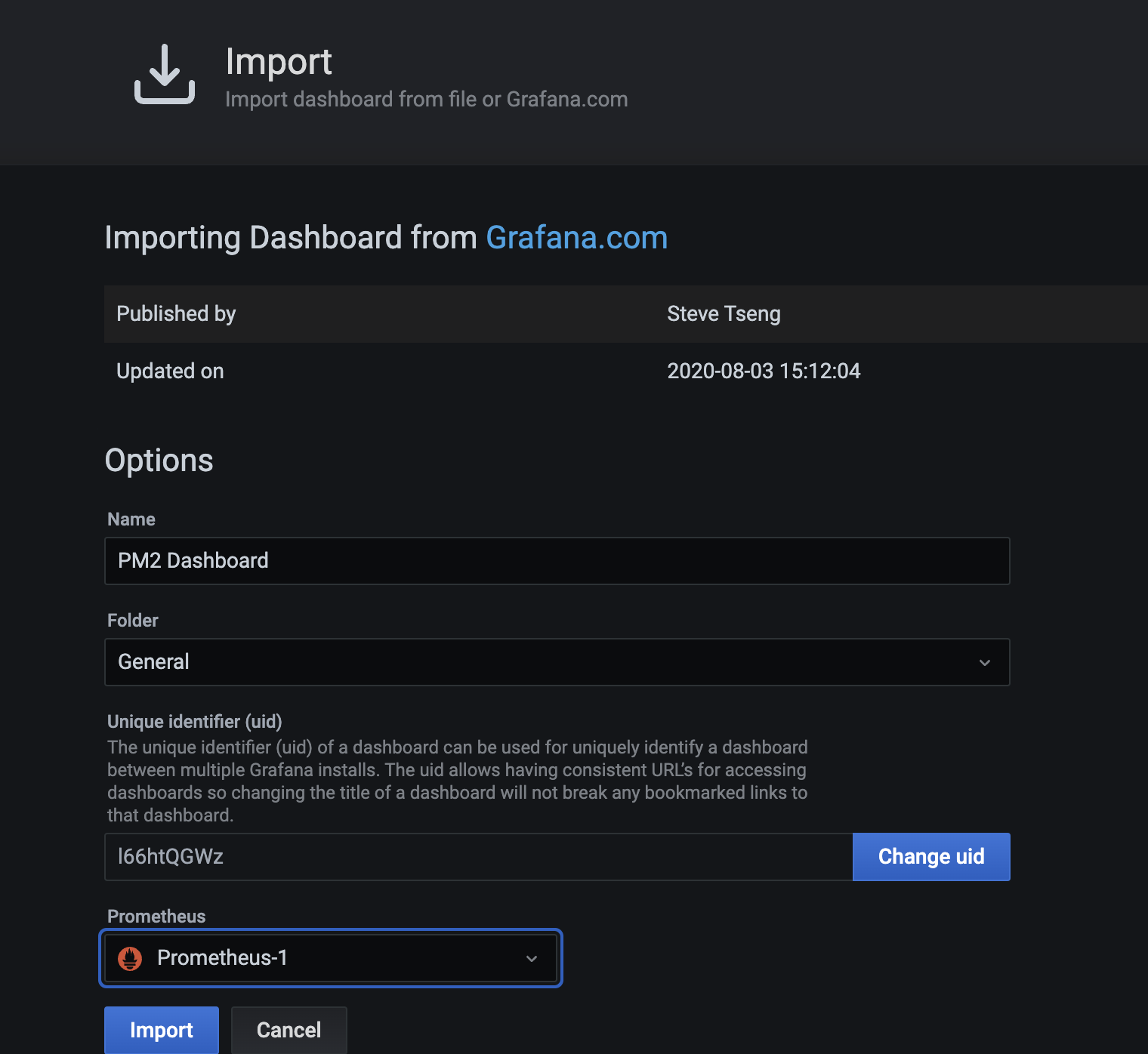 3.Name, Folder, Prometheus 선택후 import 클릭