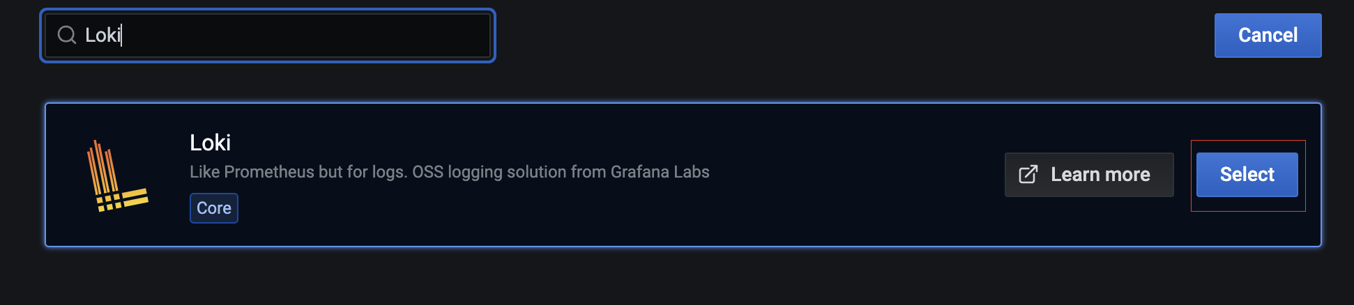 검색 창에 Loki 를 검색한 후에 Select 버튼을 클릭합니다.