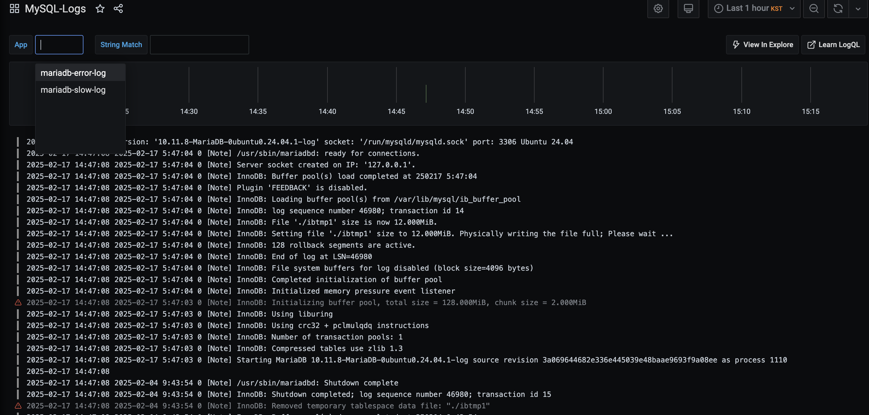 위의 글에선 MariaDB 로깅 시스템 적용을 예로들었으나 다른 시스템도 위와 같이 적용을 하면 됩니다.