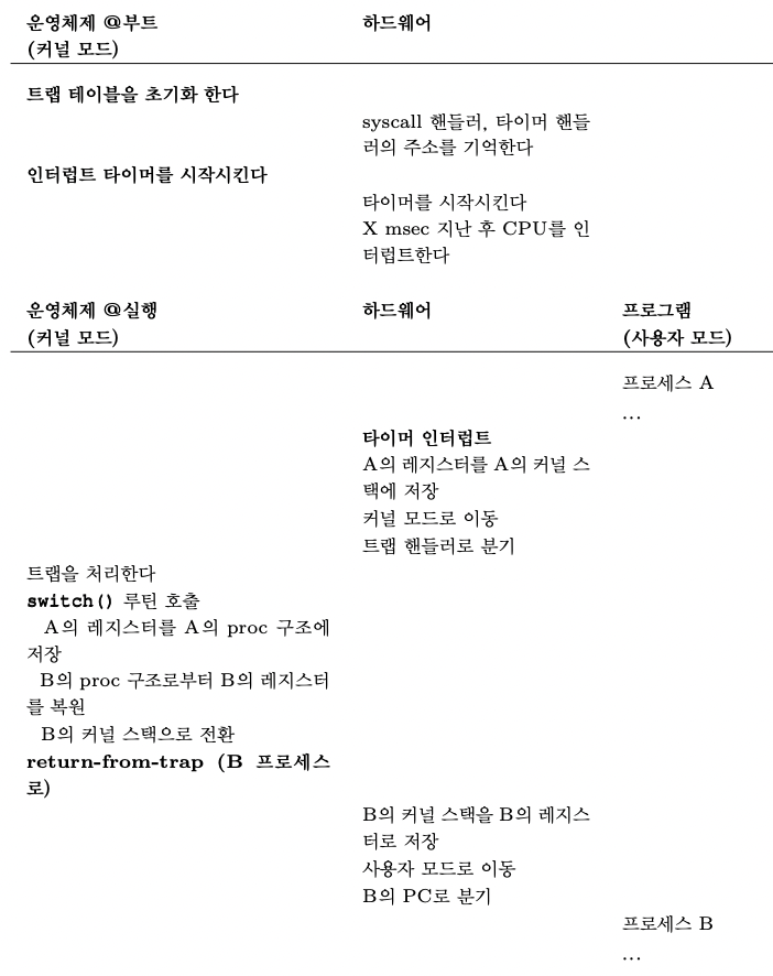 운영체제가 해야하는 작업은 현재 실행 중인 프로세스의 레지스터 값을 커널 스택, PCB에 저장하고 곧 실행될 프로세스의 커널 스택으로부터 레지스터 값을 복원하여 상태정보를 알아낸다. (커널 스택은 각 프로세스가 하나씩 가지고 있고 실행 중인 프로세스의 커널 스택으로 전환.) 왜 복원한다고? return-from-trap 명령어가 실행 될 때 현재 실행 중이던 프로세스로 리턴하는 것이 아니라 다른 프로세스로 리턴하여 실행을 다시 시작 가능.