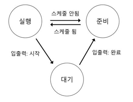 실행 상태에서 입출력 시작 시 대기, 입출력 완료 시 준비, 준비에서 실행으로 스케줄 되지만, 실행에서는 준비로 스케줄 안 됨.