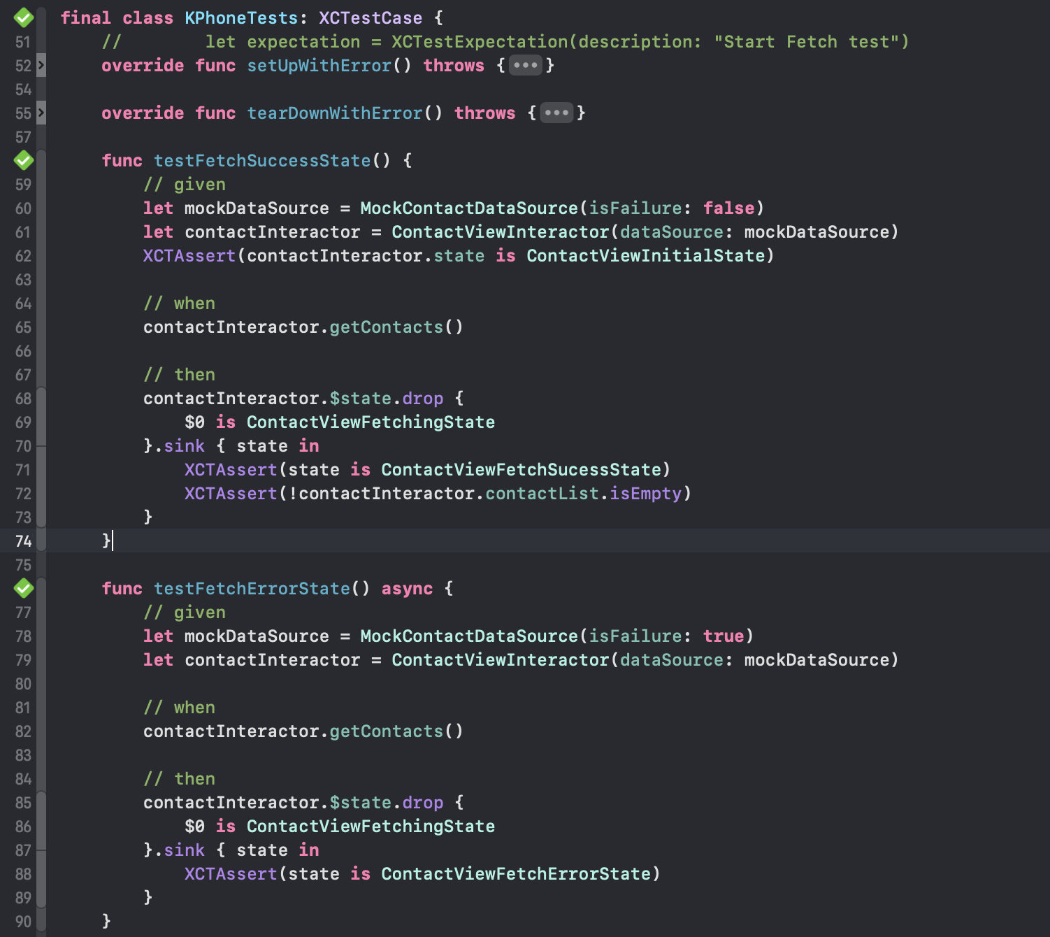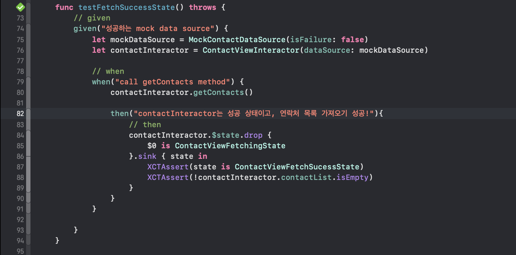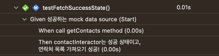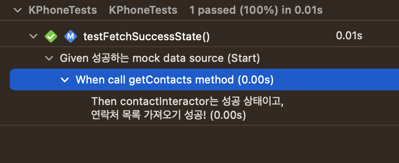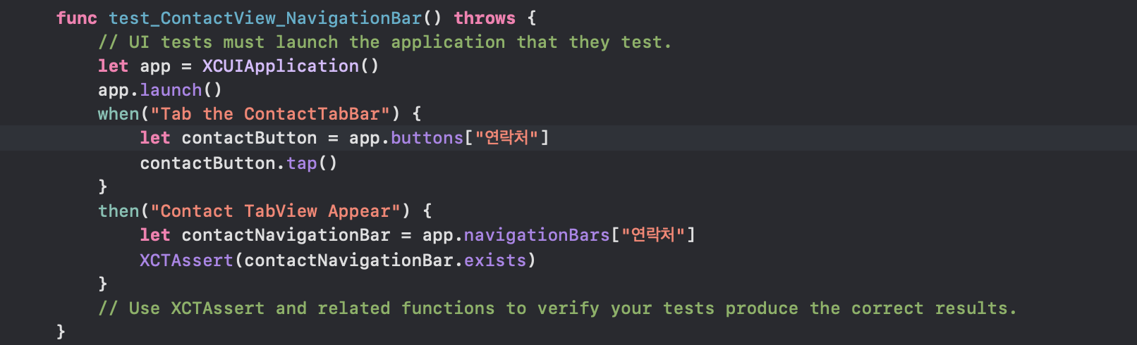 given 섹션에서는 필요한 모든 값을 설정when 섹션에서는 테스트 중인 코드를 실행then 섹션에서는 예상한 결과를 확인하며,XCTest의 호출 순서