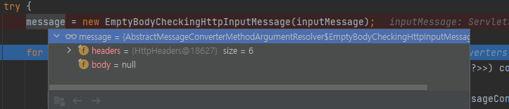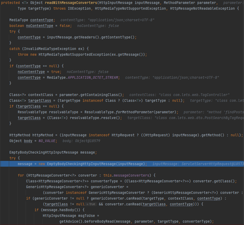 message.hasBody() 가 false가 되기 때문에, 결국 readWithMessageConverters는 null을 리턴하게 된다.