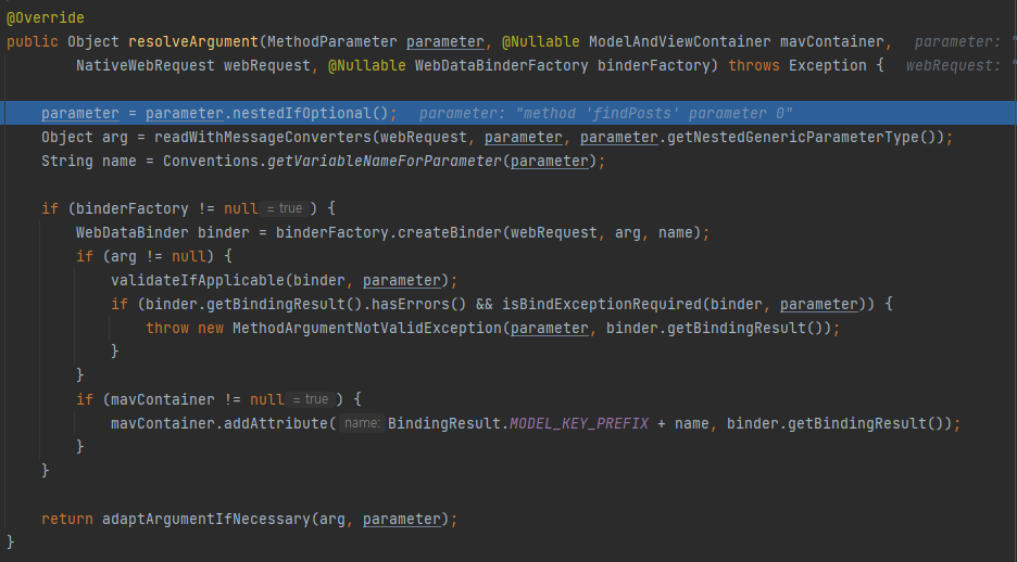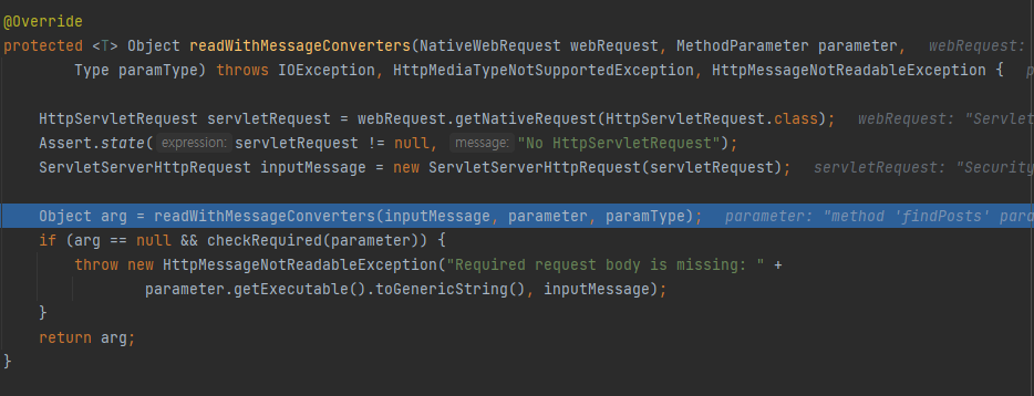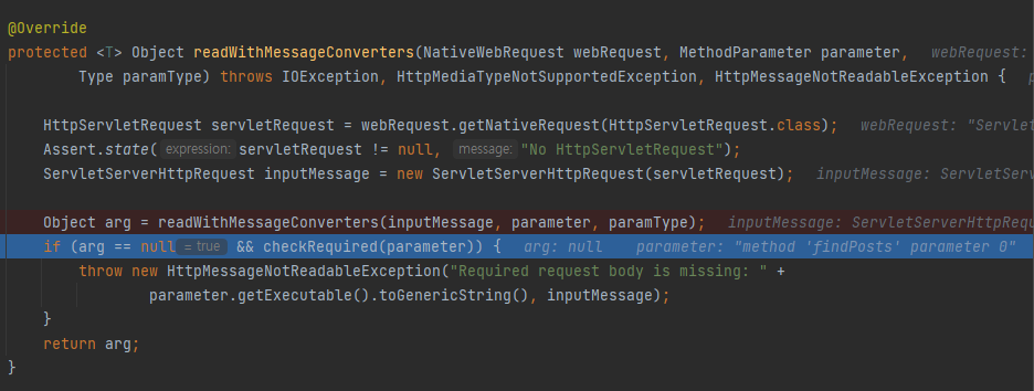 arg값이 null이 되기 때문에 if문에 걸려 HttpMessageNotReadableException이 발생하게 된다.