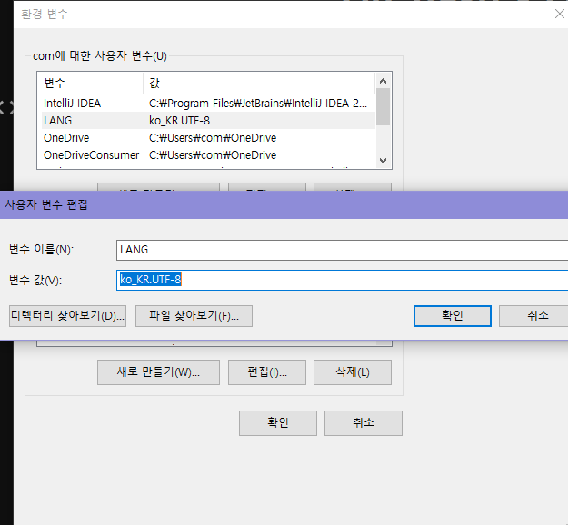 윈도우바에서 찾기 - 시스템 환경 변수 설정- 환경 변수-사용자 변수 편집