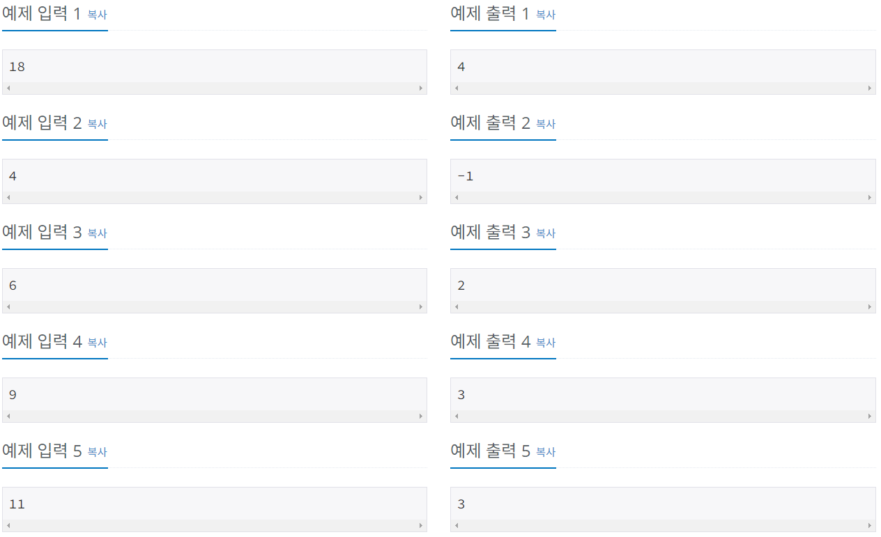 - 딱 맞아 떨어지지 않으면 -1을 출력한다(4kg, 7kg 처럼)