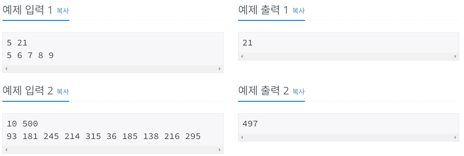 - 카드 N장과 숫자 M이 주어질 때 카드 N장 중 3장의 합이 숫자 M을 넘지 않으면서 최대한 가까운 카드 3장의 합을 구한다