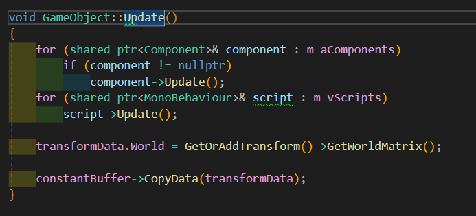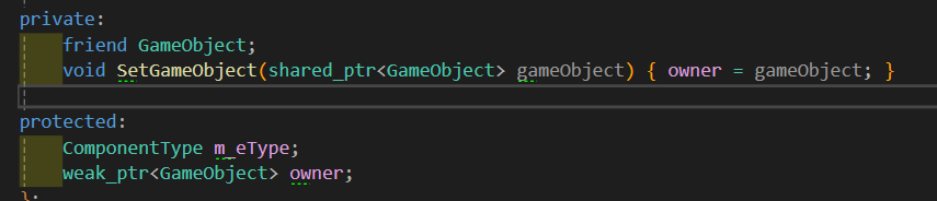 - SetGameObject 함수에서 GameObject 타입의 변수를 가져와 owner 변수에 저장하면서 이를 통해 Render나 Transform등의 정보를 가져올 수 있게 매개변수로 저장해주는 함수이다