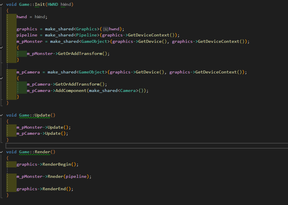 - 테스트를 위해 Game class에 GameObject로 monster 변수와 camera 변수를 만들어 초기화 및 Update, Render를 해준다