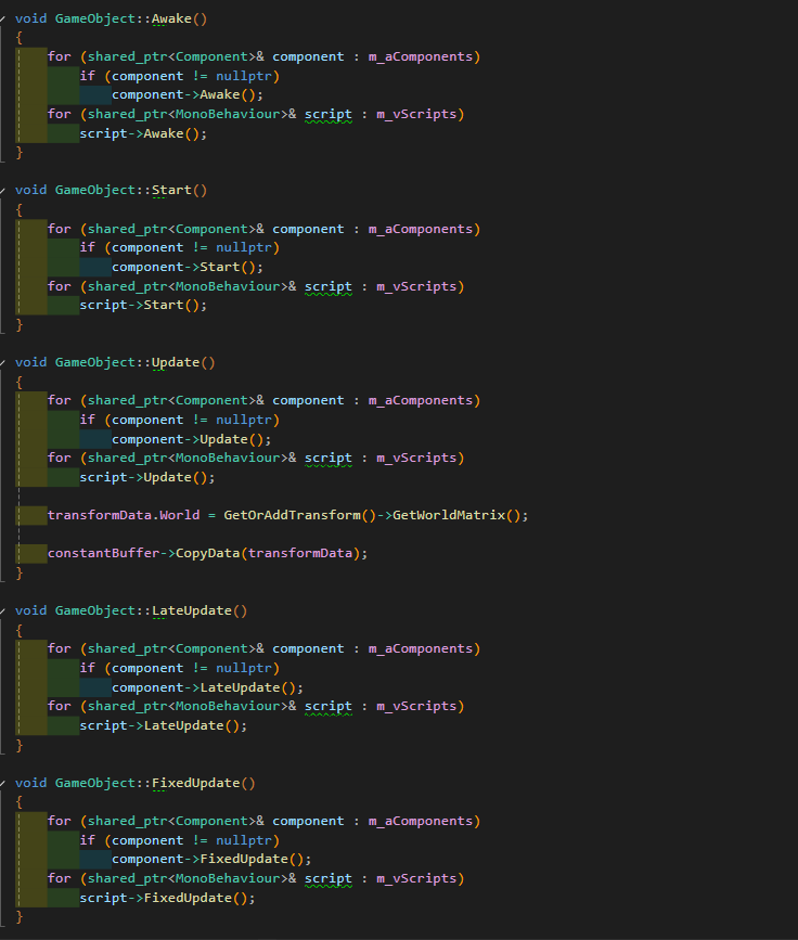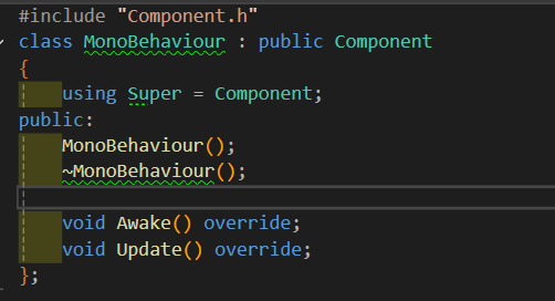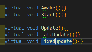 - Component 클래스에 Start처럼 게임이 시작 됐을 때 값을 초기화 해주거나 Update처럼 매 프레임 Update되는 정보를 변경해주는 함수 뿐만 아니라 Awake 처럼 게임이 시작되기 전 값이 호출이 되거나 Update보다 늦게 Update를 하는 함수 등을 가상화 함수로 만들어준다