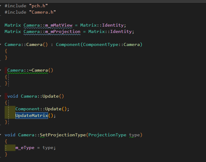 - 따라서 카메라는 왠만하면 하나만 존재할것 이므로 언제 어디서든 View와 Projection 행렬을 사용할 수 있게 static 변수로 만들어 초기화 해준다