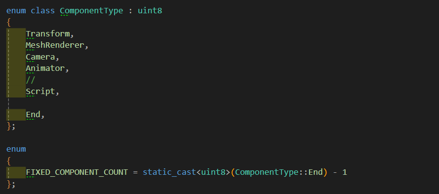 - enum으로 FIXED_COMPONENT_COUNT의 시작 번호를 ComponentType::End -1를 통해 Index로 접근이 가능 할 수 있도록 만들어 준다