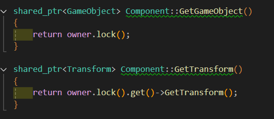 - SetGameObject에서 owner 변수에 현재 GameObject 대한 정보를 저장해 줬으므로 두 함수에선 owner를 통해 필요한 정보를 바로 가져올 수 있게 함수로 만든것이다