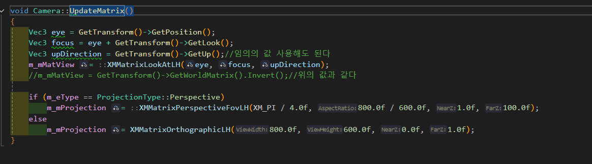 - UpdateMatrix 함수에서는 View와 Projection 행렬을 구해줄 것이다