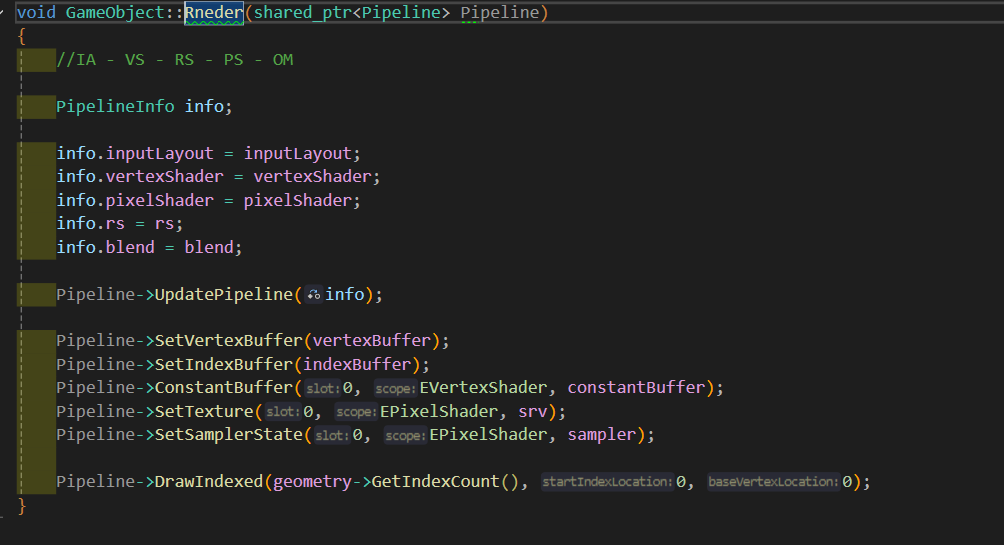 - Render 함수에서는 GameObject에 Rnedr를 하는 기능을 직접 넣어주는 것이 아닌 렌더링을 관리하는 부품을 넣어주고 이것이 있으면 렌더링을 하고, 존재하지 않으면 렌더링을 하지 않는 방식으로 기능을 할 것이다