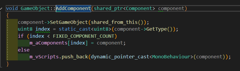- 그렇지 않다면 현재는 고정되지 않은 ComponentType은 Scripts만 존재하므로 m_vScripts에 component를 MonoBehaviour의 *로 캐스팅해 push_back해준다