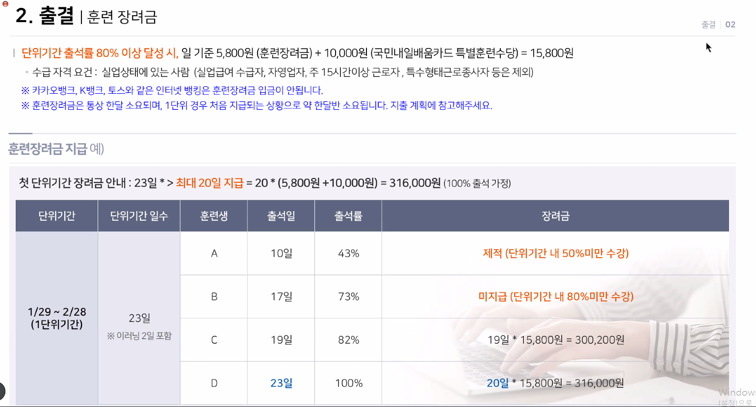 이렇게 80% 수강시 한달에 31만원 정도 지급한다.