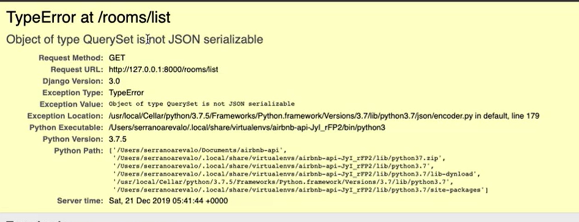 다음과 같은 에러가 나온다. QuerySet은 JSON으로 변환이 불가능하기 때문이다.