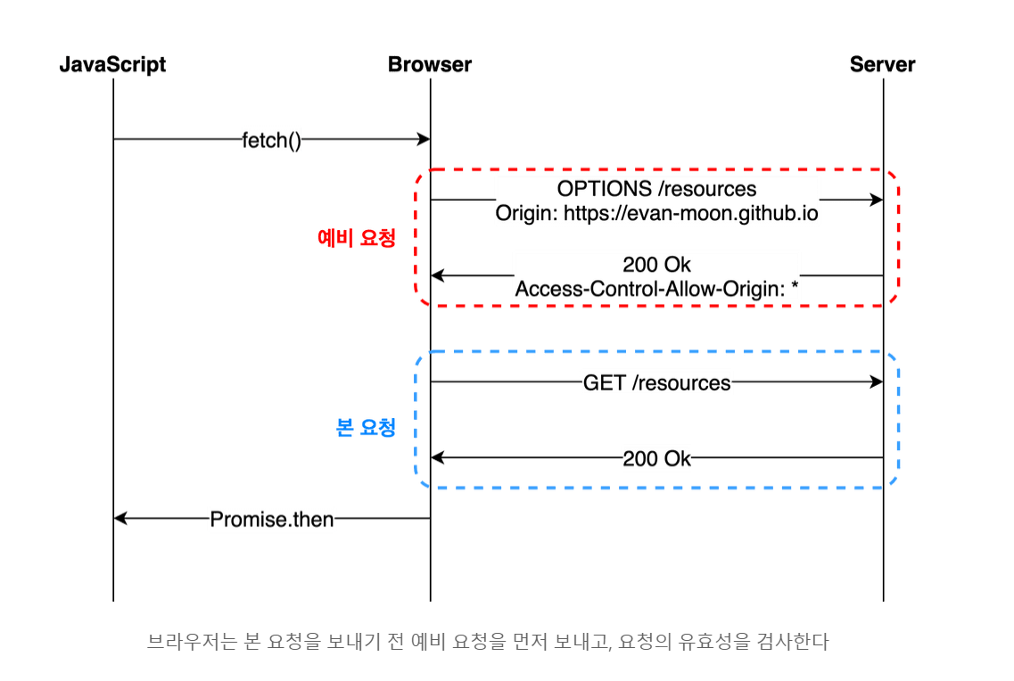 이 상황일 때에 브라우저는 요청을 한 번에 보내지 않고 예비 요청과 본 요청을 나누어서 서버로 전송한다.
