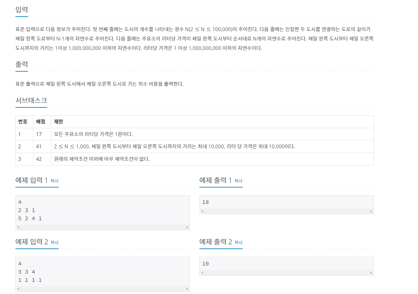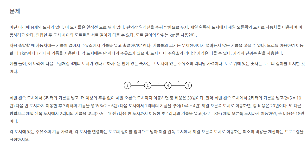 다음번 도시에 넣을 기름 가격이 첫 번째 도시에서 넣은 기름의 가격보다 작을 경우, 결과갑을 해당값으로 업데이트 해준다.