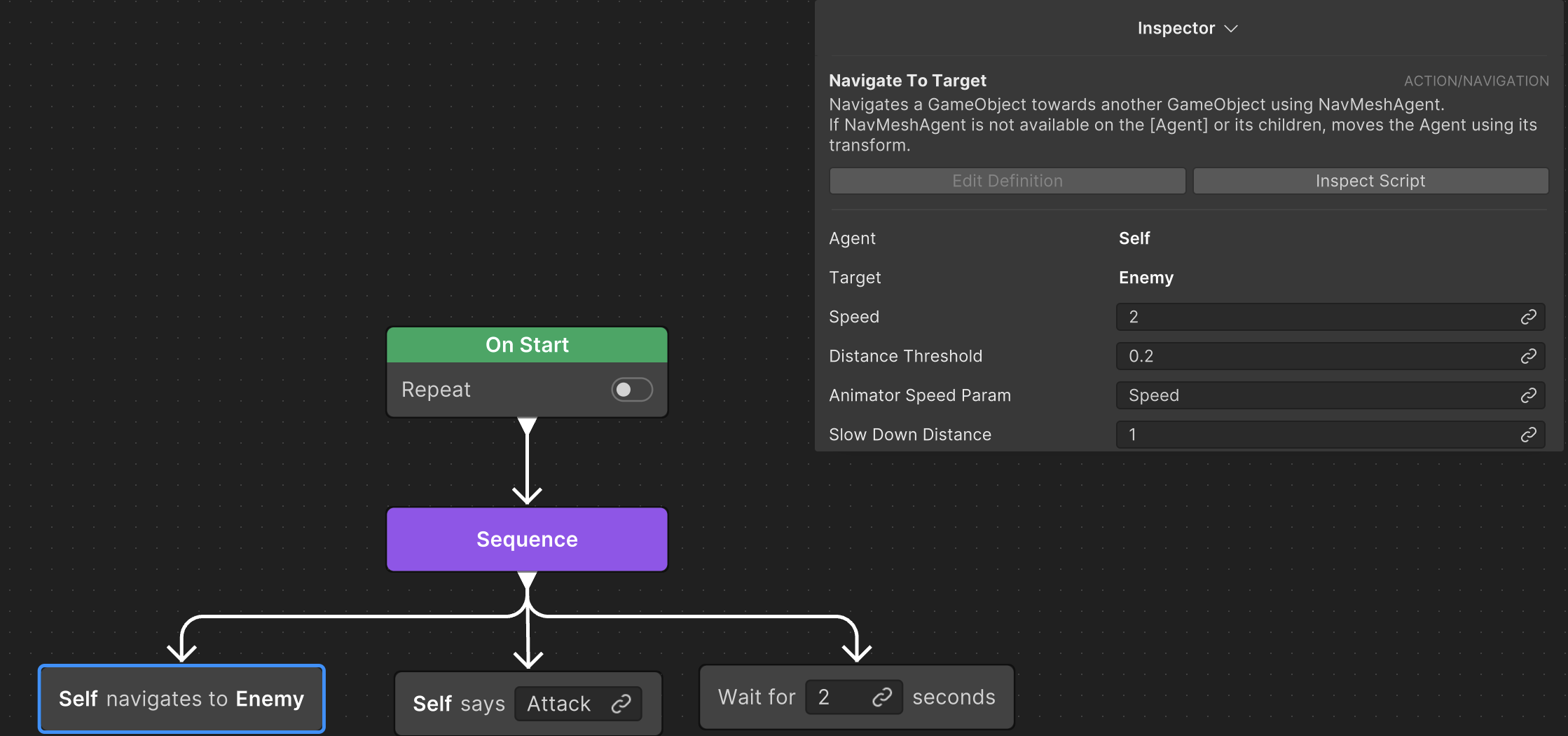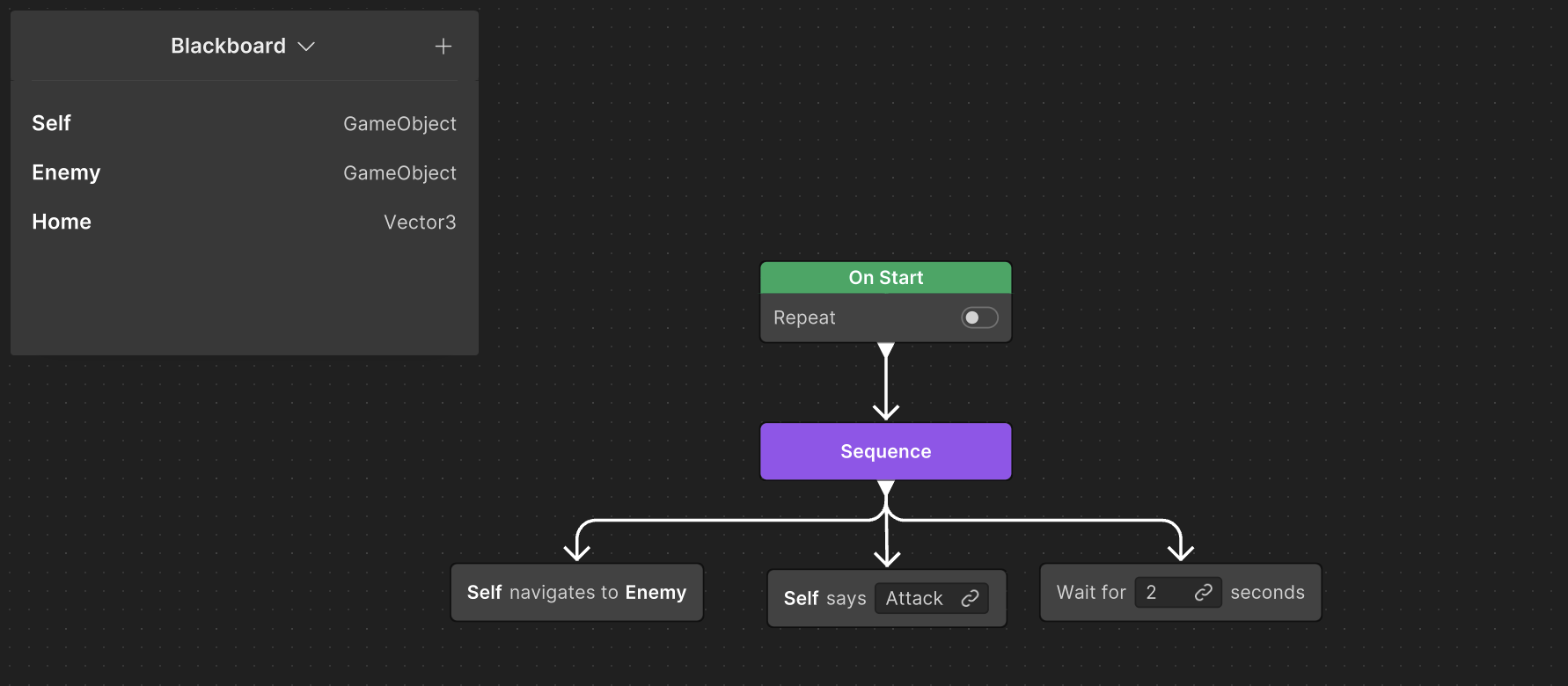 위의 이미지는 Behavior Graph를 통해서 만든 간단한 AI이다. 캐릭터(Self)가 Target의 위치를 따라가고, 그 위치에 도달하면, 콘솔 창에 Attack이라는 로그가 2초 간격으로 출력된다. 현재 Sequence하위의 노드들은 왼쪽부터 오른쪽으로 순차적으로 진행되는데, 노드들의 위치를 바꾸면 결과물도 바뀌게 된다.