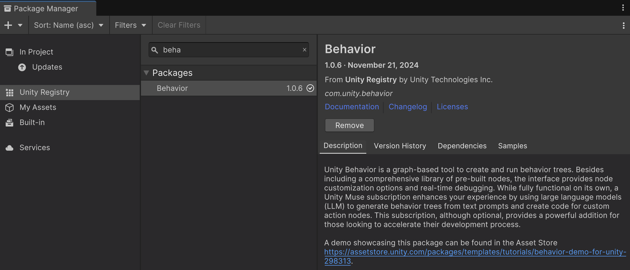 기본적으로 제공되는 기능은 아니다. Package Manager에서 이를 설치해주어야 한다. 우선, 아래의 사진과 같이, Unity Registry에 있는 Behavior 패키지를 다운받는다.