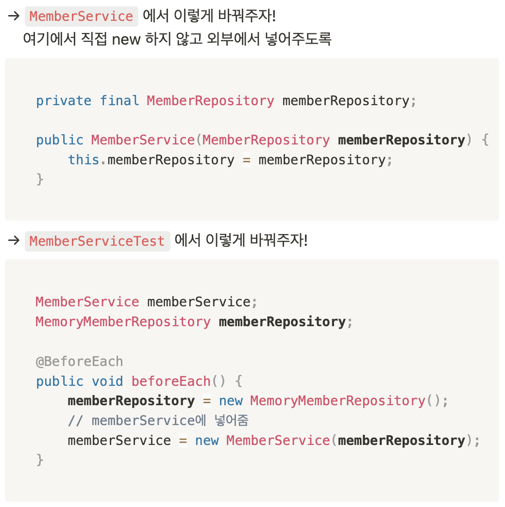 ex) MemberService와 MemberServiceTest에서 같은 MemoryMemberRepository를 쓰도록