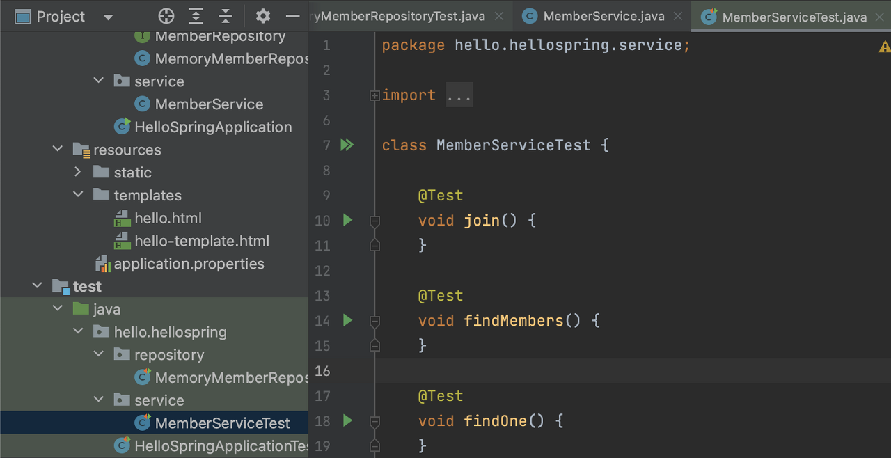 클래스(MemberService)에서 command + shift + T
