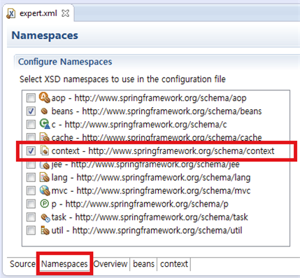 xml파일에서 우클릭 > Open With > Spring Config Editor > 하단 Namespaces > Context 체크 → 위 두줄 자동 삽입!