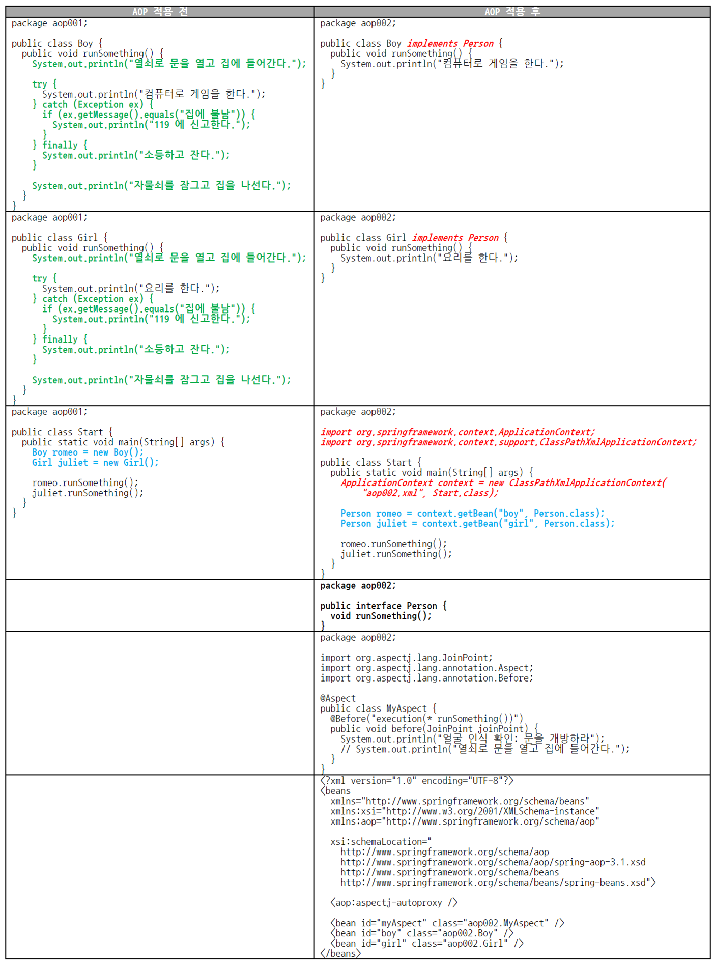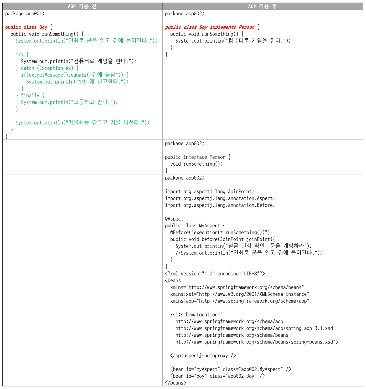 AOP 적용 전후 Boy.java 및 관련 코드 비교