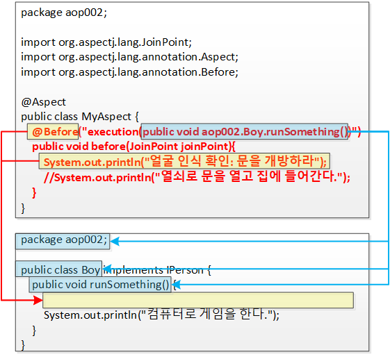→ JoinPoint : @Before에서 선언된 메서드인 aop002.Boy.runSomething()