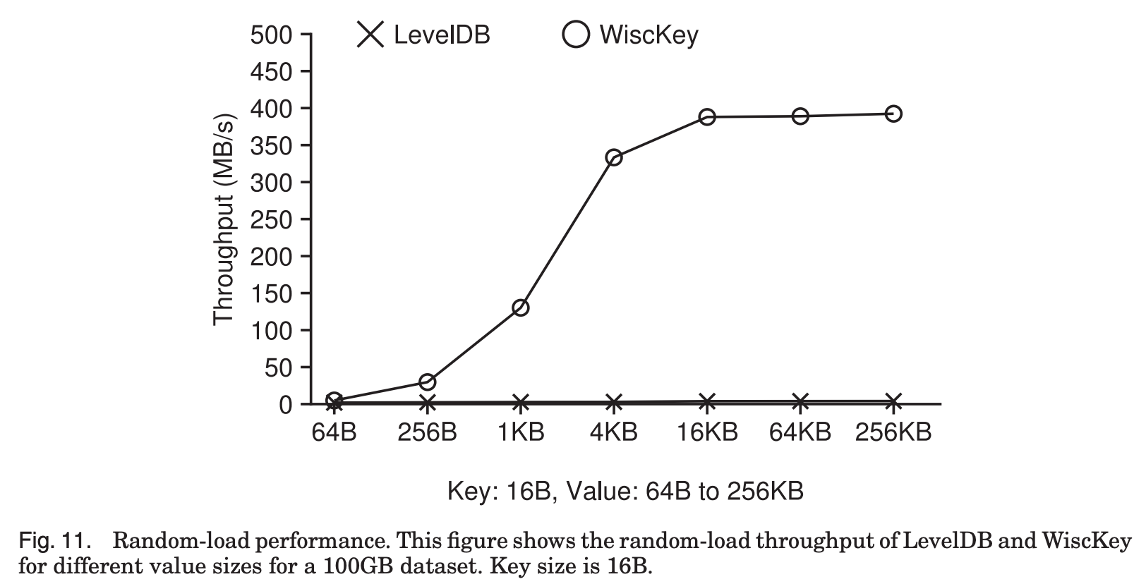 구체적으로, value Size가 1KB일 때 WiscKey는 LevelDB의 46배, 4KB일때는 111배의 throughput을 보여준다.