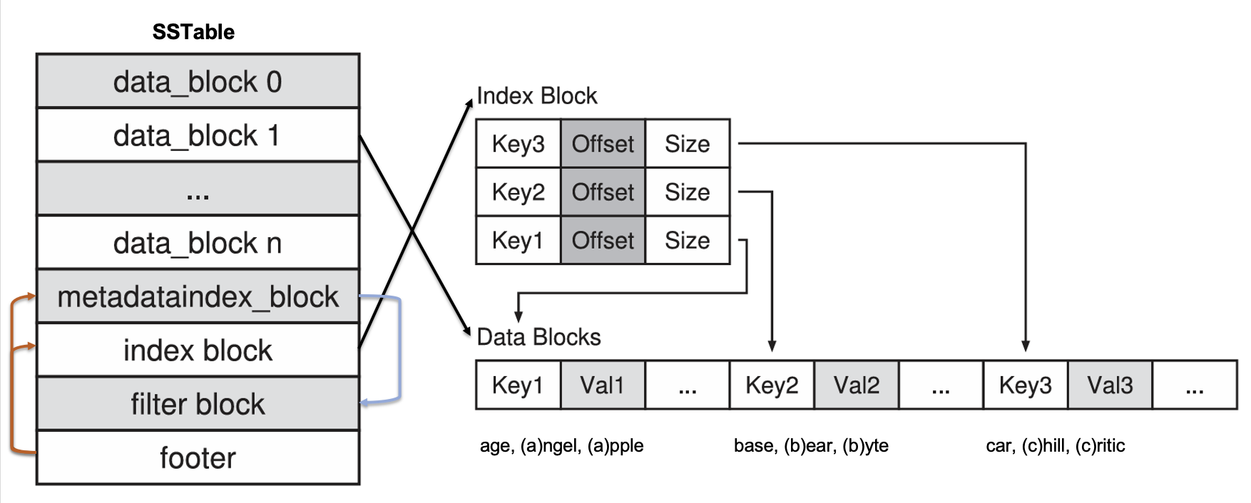 - LevelDB needs to read multiple metadata blocks within the SSTable file