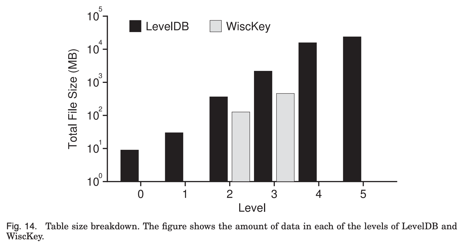 LevelDB의 LSM tree가 6개 level에 걸쳐서 총 100GB의 크기를 보이는 반면,