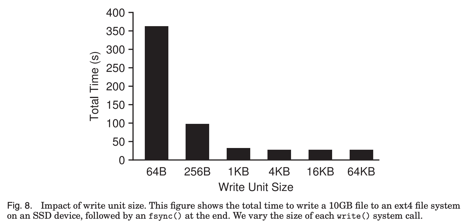그런데 아래 Fig. 8을 보면, 4KB 보다 큰 write를 하면 걸리는 시간을 크게 줄일 수 있고, device의 성능을 최대치까지 활용할 수 있다.