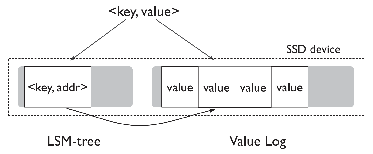 Key만 LSM-tree에 둬서 compaction시에 key만 sorting을 하고 value는 따로 Value Log라는 곳에 두고 관리한다.